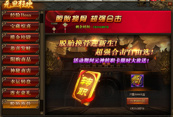 1、活动期间,玩家可在活动面板中购买元神转职卡,让元神脱胎换骨;
