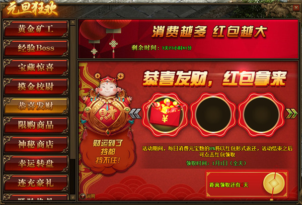 1、活动期间,每日消费元宝数的8%将以红包形式返还,活动结束后点击红包领取;