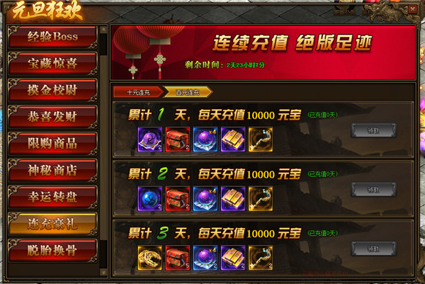 1、累积充值达到三天,可领取绝版足迹,更多特戒礼盒奖励。