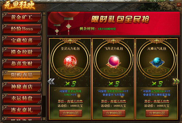 1、活动期间,玩家可在活动面板购买限购商品;(可翻页)