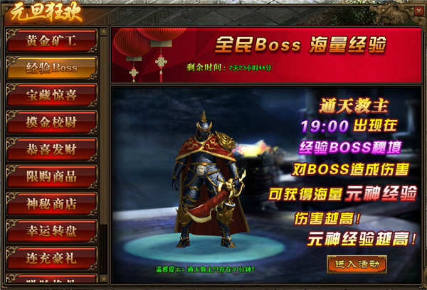 2、活动中,玩家对BOSS造成的伤害,将在活动结束后转换成元神经验并发放;