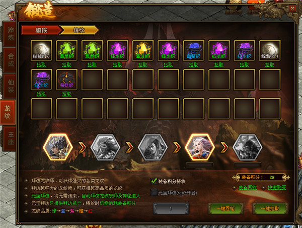 在近日,360uu《传奇世界》网页版在此为玩家开启全新玩法内容,新系统新地图震撼来袭,龙纹加身进军圣地,再探这个世界的无穷奇迹!全新龙纹系统将在你的装备上刻印龙纹,再一次激发出最强大的力量,玩家们可以在铸纹中拜访龙纹师,获取到各种类型强大的龙纹,五位实力不等的龙纹师,也将给予玩家品质不同的龙纹。玩家可以对获取的龙纹进行吞噬与升级,并将其一一镶嵌到装备之中,每件装备可以刻印九个龙纹,打造这个世界最强大的英雄装备,开启360uu《传奇世界》网页版龙纹玩法,更多神器等你揭开!