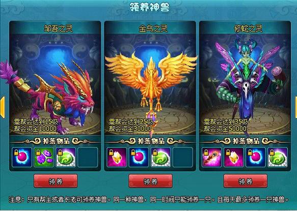 帮会增加帮会BOSS新功能:帮会可通过领养帮会神兽,对其进行供养,当神兽成长提升到一定程度,即可对神兽发起挑战,挑战成功,可获得神兽身上所携带的大量宝物。神兽极其强大,建议整个帮会的全部成员一起前去降服。
