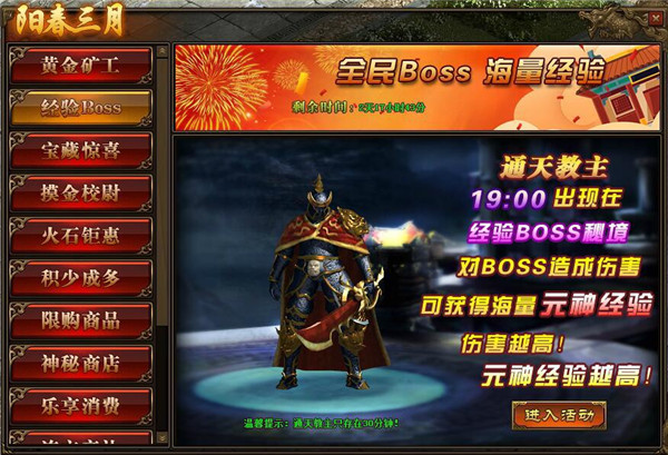 2、活动中,玩家对BOSS造成的伤害,将在活动结束后转换成元神经验并发放;