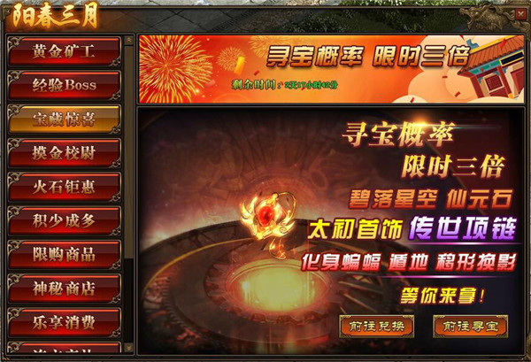 1、活动期间,玩家寻宝概率翻倍,极高几率获得太初套装,特戒钢纹,仙元石、碧落星空,乾坤遁书-移形换影、化身蝙蝠、遁地以及传世灵器*项链碎片;