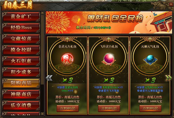 1、活动期间,玩家可在神秘商店中购买商品,商品可用金币,绑元,元宝进行购买;