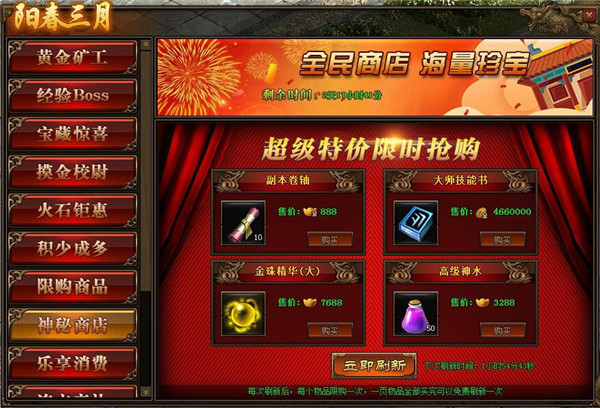 2、神秘商店每2小时自动刷新一次,也可用花费元宝立即刷新;