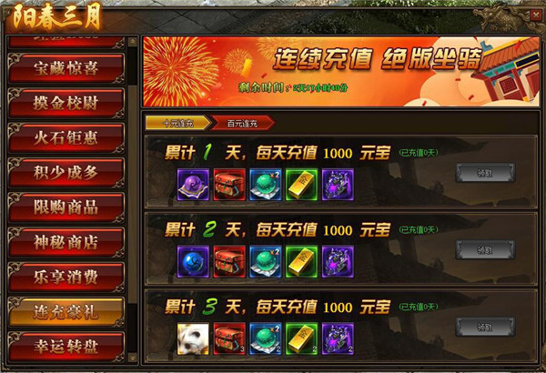 2、累积充值达到三天,可领取绝版坐骑,更多特戒礼盒奖励。