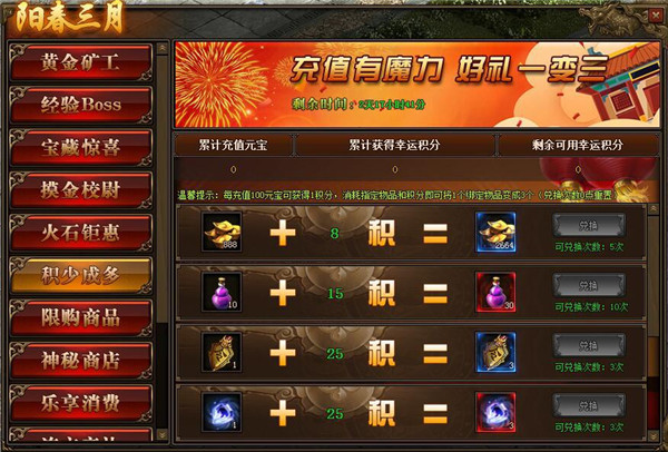 1、活动期间,每充值100元宝可获得1积分,消耗指定物品和积分即可将1个物品变成3个(兑换次数0点重置);