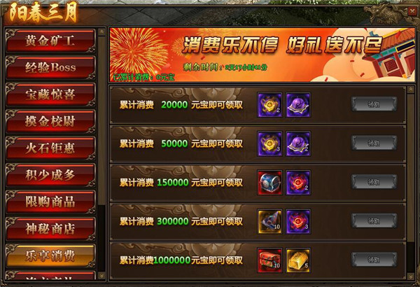 1、活动期间,玩家累计消费满足要求,可以领取洪荒首饰、修罗之羽宝盒、传世灵戒等相应奖励;