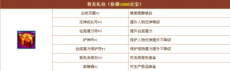 就像初恋永远值得我们珍藏一样,第一次的经历总是那么令人难忘,游戏自然也不例外,活动时间内所有玩家只要充值任意金额,均可获得我们送出的精美首充礼盒。 从开服当日起,只要玩家的角色是第一次在所在服务器进行充值,不限制任何金额,除了能获得相应的元宝之外,还都将会获得一份“首充礼盒”。