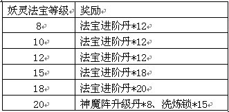 活动规则:活动期间,将灵戒洞天里任意妖灵法宝等级提升到指定等级,可获得额外系统赠礼。