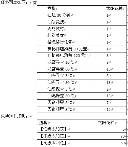 1.活动期间,玩家完成以下指定游戏内容可获得太阳花种,不同数量太阳花种可兑换不同级别的太阳花;