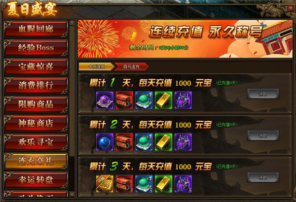 1、活动期间,每天充值10元、100元可领取境界修为、特戒礼盒。