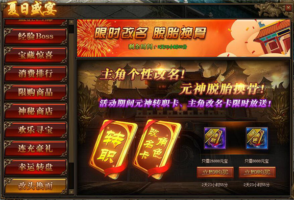 1、活动期间,玩家可在活动面板中购买元神转职卡,让元神脱胎换骨;