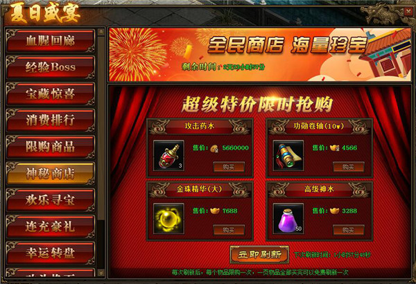 2、神秘商店每2小时自动刷新一次,也可用花费元宝立即刷新;