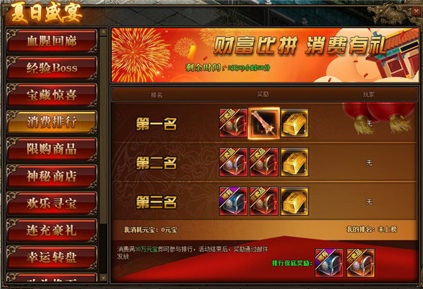 第三名:获得洪荒首饰箱*1,神品仙装宝箱*1,金条(300w)*2;