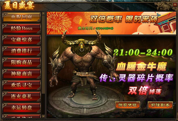 1、活动期间,玩家参与“多人副本-血腥回廊”,获得“传世灵器碎片”的概率翻倍;