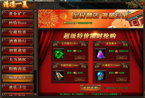 2.神秘商店每2小时自动刷新一次,也可用花费元宝立即刷新;