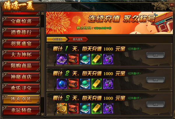 1.活动期间,每天充值10元、100元可领取境界修为、特戒礼盒。