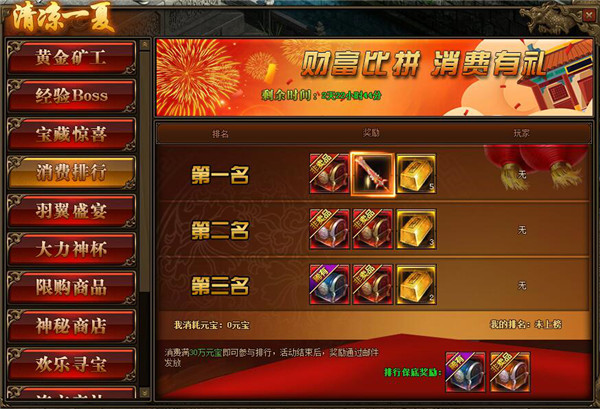 1.活动期间,玩家消费满30万元宝参与排行