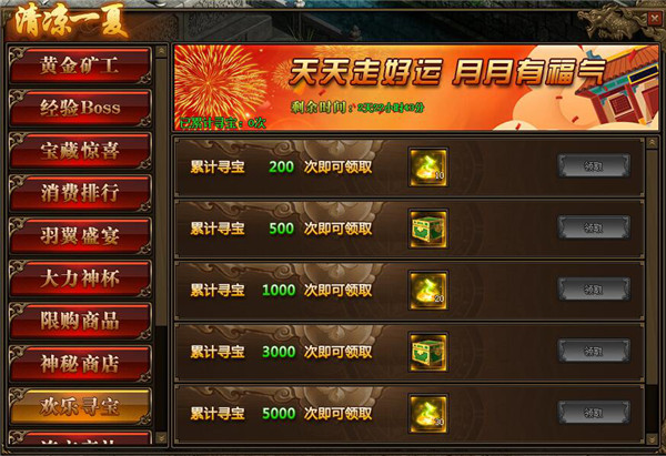 1.活动期间,玩家累计寻宝次数满足要求,可以领取阵法精华(中)、虎翼阵法宝箱、龙飞阵法宝箱、云垂阵法宝箱等相应奖励;