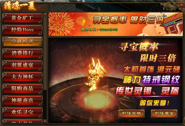 1.活动期间,玩家寻宝概率翻倍,极高几率获得太初首饰,仙元石、混元砂,神力特戒钢纹,传世灵器·手镯碎片以及传世灵器·头盔