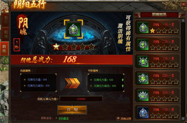 阴魄共有20阶,每个等阶分5个星级,提升阴魄等级可以给元神增加大量减伤属性