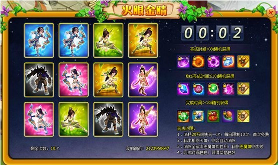 l 每日可玩10次,每日首次免费,剩余次数,每20万铜钱玩一次