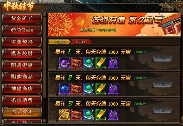 1.活动期间,每天充值10元、100元可领取境界修为、特戒礼盒。