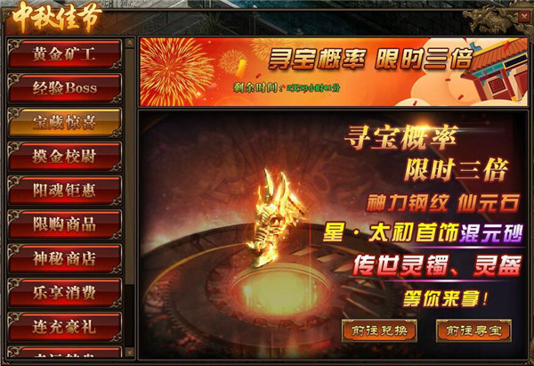 1.活动期间,玩家寻宝概率翻倍,极高几率获得星·太初首饰,仙元石、混元砂,神力特戒钢纹,传世灵器·手镯碎片、传世灵器·头盔