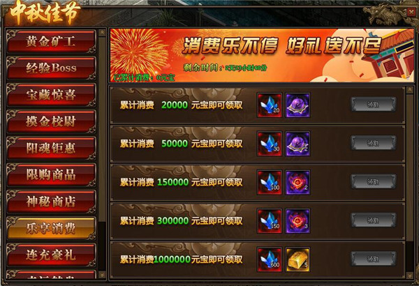 1.活动期间,玩家累计消费满足要求,可以领取境界修为、本职业星石、传世灵戒等相应奖励;