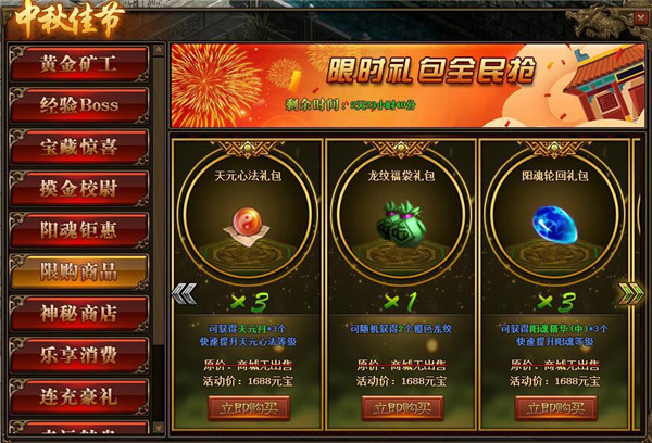 3.新增天元心法礼包、龙纹福袋礼包、阳魂轮回礼包