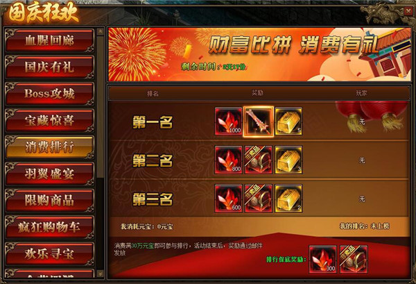 1.活动期间,玩家消费满30万元宝参与排行