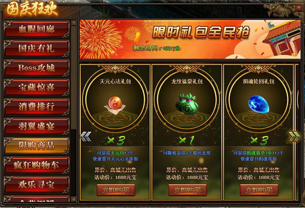 1.活动期间,玩家可在活动面板购买限购商品;(可翻页)