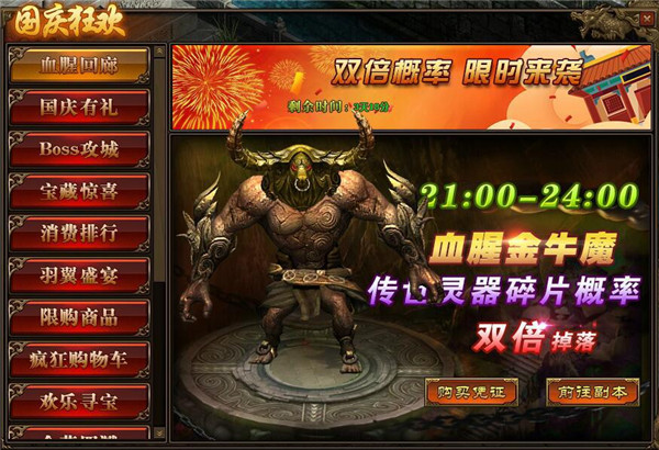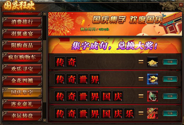 1.活动期间,玩家可通过击杀BOSS获得“传奇世界国庆乐”七字