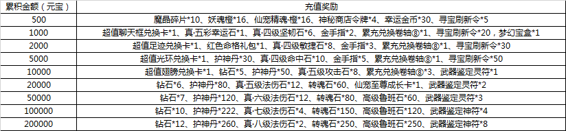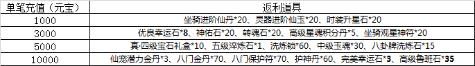 活动期间,所有玩家首次充值任意金额,即可获得价值1888元宝的首充奖励:中级星魂积分丹*4、灵幻石*2、鉴宝符*4、四级淬炼石*1、玄武仙玉*6、灵器进阶仙玉*6、鲜花99朵*1。388绑定元宝(奖励每人只能领取一次,未进行过首充的玩家还可额外获得【首充礼盒】哦)。