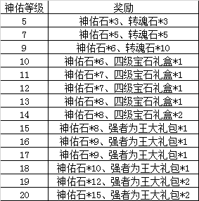 活动规则:活动期间,将任意装备神佑提升到指定等级,可获得额外系统赠礼。