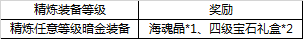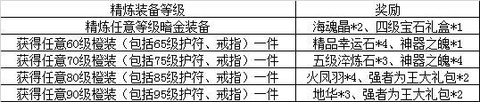 活动规则:活动期间,玩家通过橙装精炼获得任意一件橙装(包括橙色武器)或精炼成功任意暗金装备,即可获得系统奖励一份。