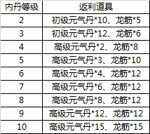 活动规则:活动期间,在刷新内丹重铸系统每消费800元宝即可获得高级元气丹*3奖励!