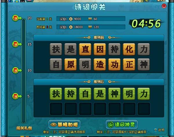 ②点击“排序前”诗词将其排列好,即为闯关成功并进入下一句诗词的闯关,过程中可使用“慧眼如炬”(只能用1次)和“请仙问灵”(只能用3次)两种锦囊;