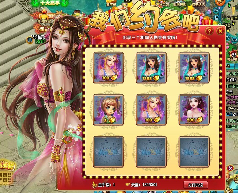 ②刮出3钟相同美女的卡片即可获得奖励,最高奖励1288非绑定元宝哦!
