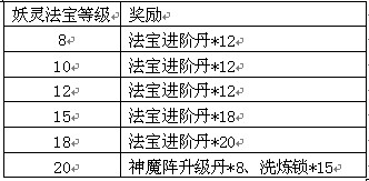 活动规则:活动期间,将灵戒洞天里任意妖灵法宝等级提升到指定等级,可获得额外系统赠礼。