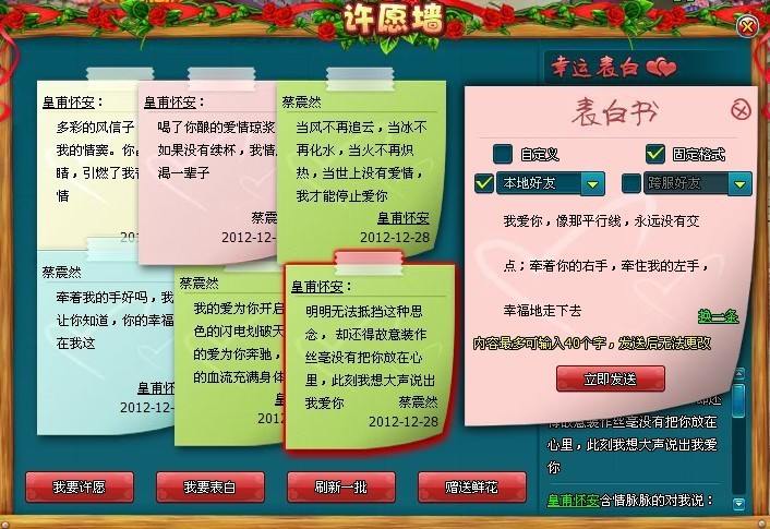 ② 玩家还可以在许愿墙上查看其他玩家写下的表白和愿望,假若被某条表白感动,你还可以向该表白者送花表示祝福。