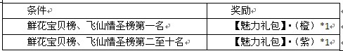 获得跨服鲜花榜的鲜花宝贝榜、飞仙情圣榜前十的玩家,除了可获得特殊炫酷称号及【魅力礼包】之外,还可获得以下额外奖励哦。