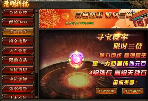 1.活动期间,玩家寻宝概率翻倍,极高几率获得星·太初首饰,仙元石、碧落星空,传世灵器、传世灵甲,初级天魂石、高级天魂石以及4级魂石