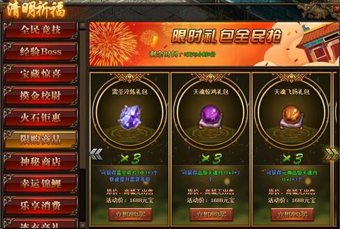 1.活动期间,玩家可在活动面板购买限购商品;(可翻页)
