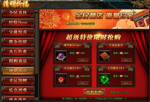 1.活动期间,玩家可在神秘商店中购买商品,商品可用金币,绑元,元宝进行购买;