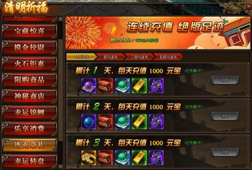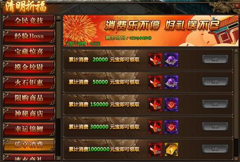 1.活动期间,玩家累计消费满足要求,可以领取境界修为、本职业星石、传世灵戒等相应奖励;