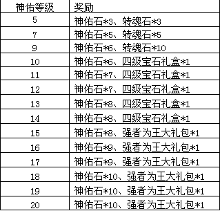 活动规则:活动期间,将任意装备神佑提升到指定等级,可获得额外系统赠礼。